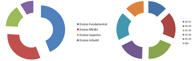 E da faixa etária seguida dos respectivos percentuais: 10-15 13%, 16-24 18%, 25-34 19%, 35-44 17%, 45-59 19%, 60+ 13%.