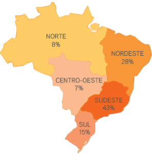 Aonde estão os usuários da internet brasileira? Estudos apontam que 43% está na reagião Sudeste, 28% no Nordeste, 15% no Sul, 8% no Norte e 7% no Centro-Oeste.